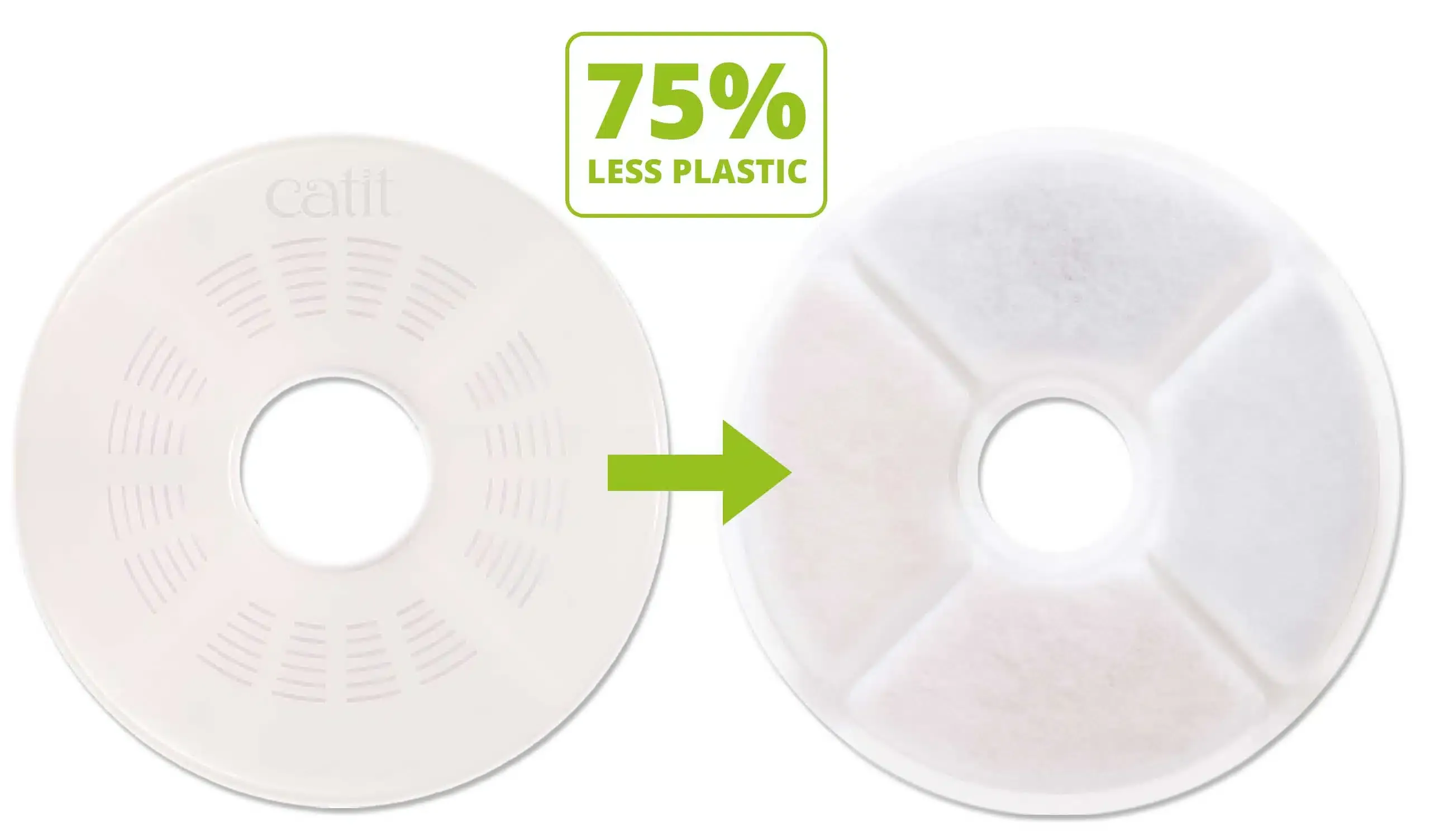 Filter pad containing 75% less plastic compared to the original filter cartridge Triple action water filtration with filter mesh, active carbon, and ion exchange resin For use with Catit Flower Fountains